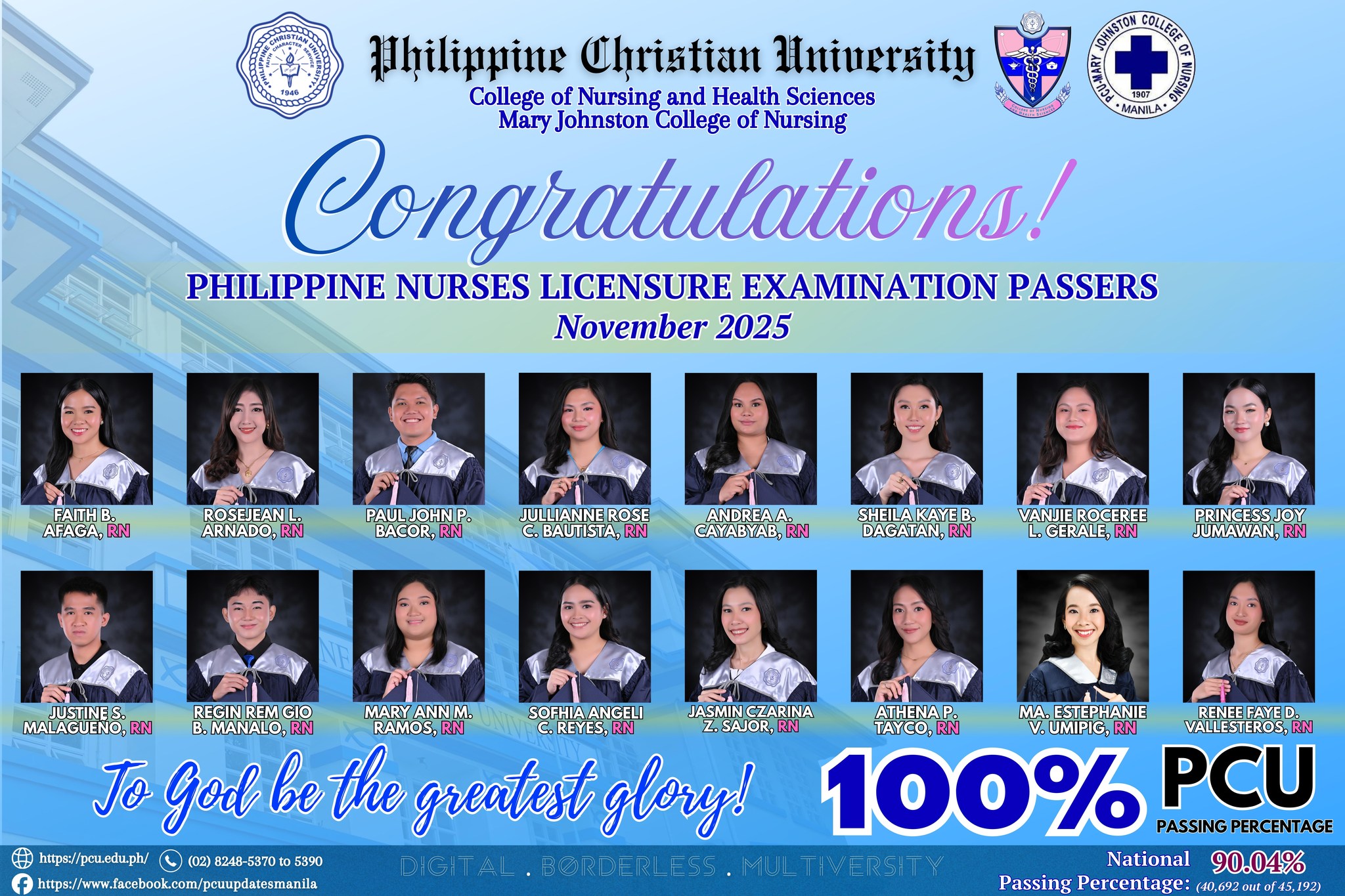 The college offers excellent nursing and health sciences academic programs. With a consistent 100% passing rate in the Philippine Nursing Licensure Examinations and maintaining Level III accredited by the Association of Christian Schools, Colleges and Universities Accrediting Agency, Inc. (ACSCU-AAI), the college’s alumni occupy prominent positions in the local and international health care establishments. In June 2007 and June 2008, PCU-MJCN was awarded by the Professional Regulations Commission as the Top 1 College of Nursing having 100% passing in the Nurse Licensure Examination (30-99 examinees). This is just a confirmation of God’s love and faithfulness to PCU-MJCN.